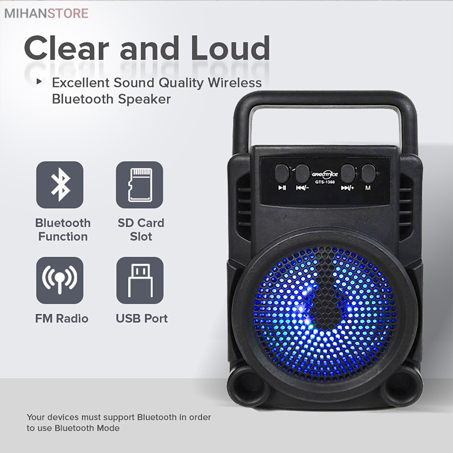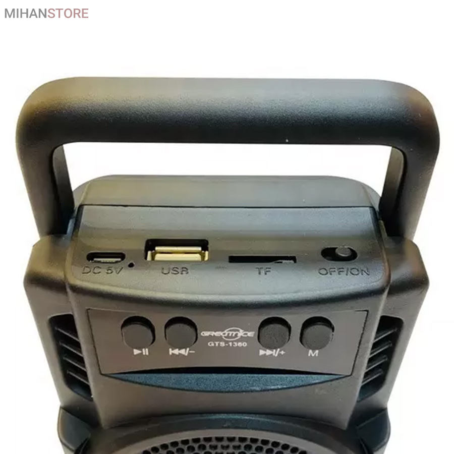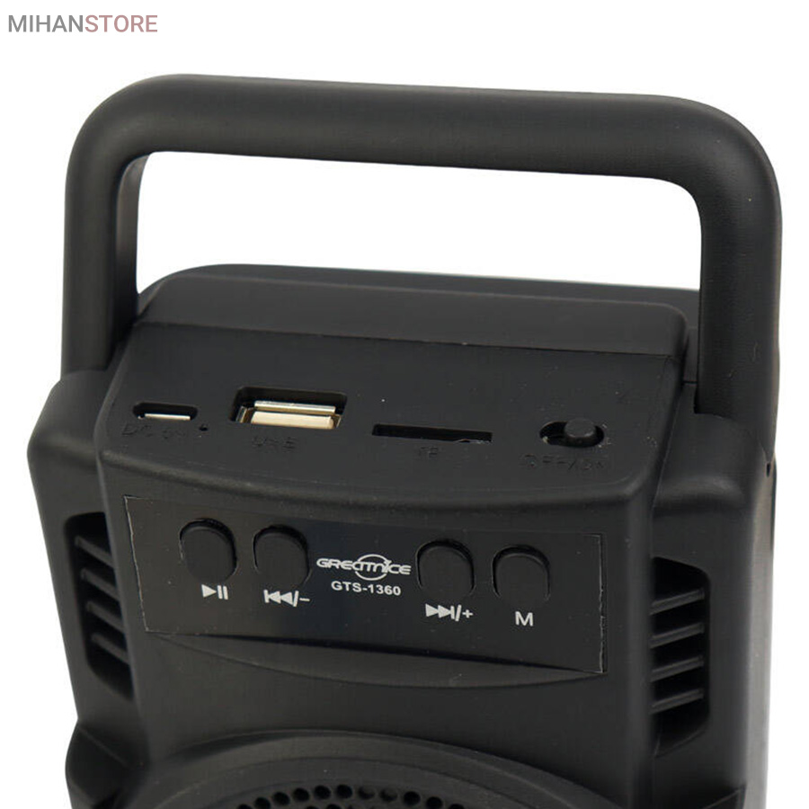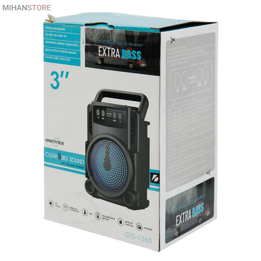 اسپیکر بلوتوثی قابل حمل Fantastic Quality مدل GTS - 1360 یا گریت نایس طراحی زیبا و جمع و جور دارد که مناسب برای پیاده روی ، کوهنوردی ، مسافرت و … می باشد. این اسپیکر داری رقص نور ال ای ادی می باشد. یکی از تفریحات لذتبخش، گوشکردن به آهنگی دوستداشتنی و شاد در گردشها همراه دوستان است. زمانی ضبط صوتها همراه بسیار خوبی برای ارایهی موسیقی در هر مکانی بودند؛ ولی با پیشرفت تکنولوژی و منسوخ شدن استفاده از نوار کاستها، ضبط صوتها جای خود را به اسپیکرهای قابلحمل دادند. اسپیکرهای قابلحمل معمولا برای تامین انرژی خود از یک باتری داخلی قدرتمند استفاده میکنند. این اسپیکر برای اتصال به تلفن همراه، پخشکنندهی صوتی و حتی رایانه و لپتاپ از فناوری بلوتوث بهره میبرد. اندازهی بسیار کوچک در برابر قدرت بالای این اسپیکر شما را شگفتزده خواهد کرد. برای استفاده از این اسپیکر تنها کافی است آن را از طریق بلوتوث به پخشکنندهی صوتی خود متصل کنید و از صدای قدرتمند آن لذت ببرید.
