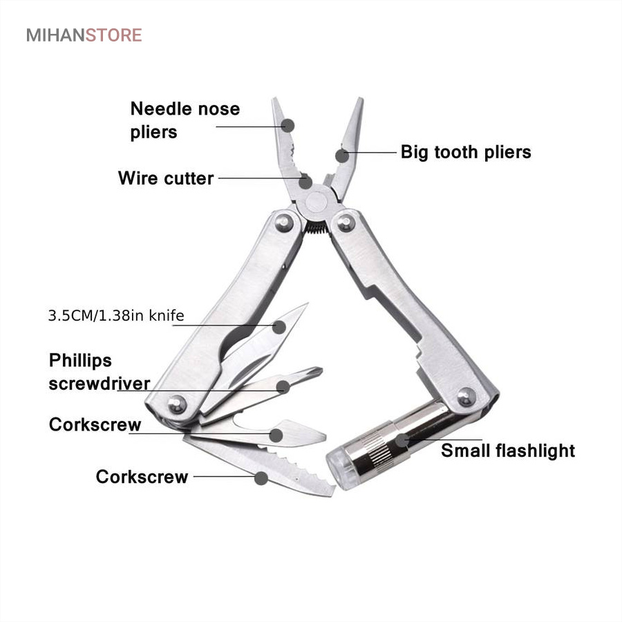 بسیاری مواقع در طول روز یا زمان سفر، به ابزار بسیار سادهای مانند پیچگوشتی، چاقو و… نیاز پیدا میکنید؛ ولی قطعا هیچکس نمیتواند همهی این ابزارها را در کنار خود داشته باشد. در چنین شرایطی یک مجموعهابزار، بسیار کارآمد خواهد بود. این محصول ۷ ابزار با ۹ عملکرد دارد. از ابزارهای داخلی این محصول میتوان به «در بطری بازکن» اشاره کرد که برای بازکردن در بطری نوشابه به شما کمک میکند. همچنین این محصول یک «تیغه چاقوی کوچک» دارد که برای آشپزی در زمان سفر کاربردی است. از دیگر ابزارها میتوان به «اره» اشاره کرد که تقریبا تیز است و برای کارهای ظریف استفاده میشود. یک «پیچگوشتی چهارسو» نیز در این مجموعه لحاظ شده است تا بتوان در صورت لزوم، با خیالی راحت از آن استفاده کرد. بدون شک کاربردیترین ابزار این مجموعه «چراغقوه» است. این چراغقوه به صورت پیچی روشن و خاموش میشود و نور مناسبی برایتان تولید میکند. اصلیترین ابزار این وسیله «انبردست» است که بهنسبت اندازهاش، قدرت مناسبی دارد. قسمت پایینی انبردست نیز به دلیل تیغههایی که دارد، مانند سیمچین عمل میکند. برای اینکه بتوانید این محصول را با راحتی بیشتری حمل کنید، کیف کوچکی نیز همراه آن عرضه شده است.